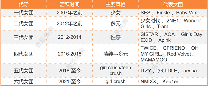 过去16年间,K-pop女团从二代到六代,也经历了风格的不断变化。 目前,韩国几代女团的划分主要有三种:按照出道时间每隔几年分为一代、按照绝对的影响力以改朝换代的模式来界定、按照女团平均生命力的维持时间来区分。虽然各种划分都有一定的道理和意义,但又都存在或多或少的局限性和片面性。 所以,最合理的划分就是在活动周期(一般每四年划分一代)的基础上,适当结合参照对比。不过也有例外,有时也将一个或者同时出现的两三个领头羊女团的出现算一代的开端。经音乐先声梳理,迄今为止,K-pop共有六代女团。