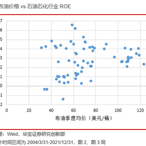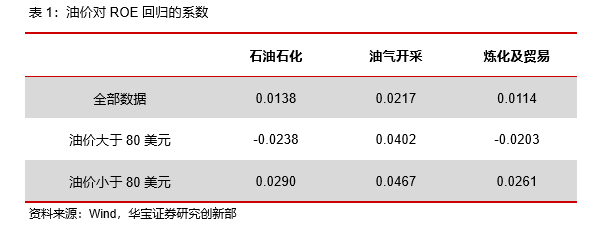 我们统计了布油的季度均价,并将其和申万石油石化(801960.SI)行业单季度ROE做比较。从散点图中可以看到,在油价小于80美元的区间中,石化行业的ROE整体上是随着油价的上涨而上升的,但当油价超过80美元之后,石化行业的ROE就处在一个平台上难以进一步提升了。我们将数据拆成油价大于80美元和油价小于80美元两部分,并分别进行线性回归。对于油价小于80美元的这部分数据,回归系数为0.0290,说明当油价小于80美元时,油价每上涨一美元可以提升石油石化行业ROE0.029%。而当油价大于80美元时,回归系数为-0.0238,油价每上涨一美元会降低石油石化行业ROE0.0238%。