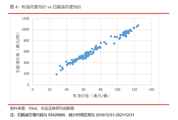 在石油化工的上游产业链中,石脑油是一种重要的原材料,它是一种轻质油品,由原油蒸馏或石油二次加工切取相应馏分而得到的。统计石脑油月度均价相对于原油月度均价的分布可以看到,两者的走势高度一致,相关性高达0.99,且在油价超过80美元时斜率并未发生显著变化。因此我们可以认为,在石化产业的上游原材料端,价格传导的通畅性并不受油价高低的影响。进一步计算原油对于石脑油的线性回归,得到的回归系数是8.34,截距项为24.12。也就是说原油价格每提升1美元/桶,石脑油价格将提升8.34美元/吨。24.12美元/吨的截距项可能反应了加工石脑油所需的固定成本。