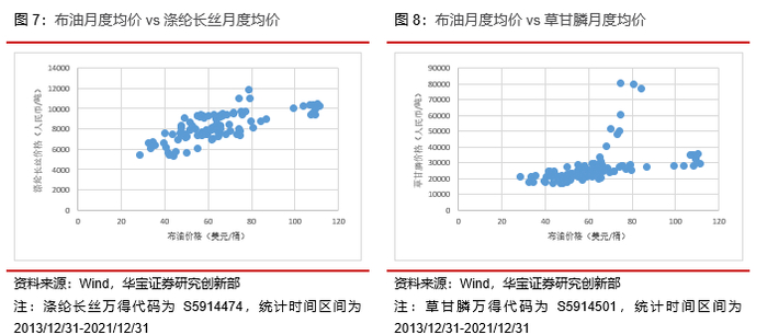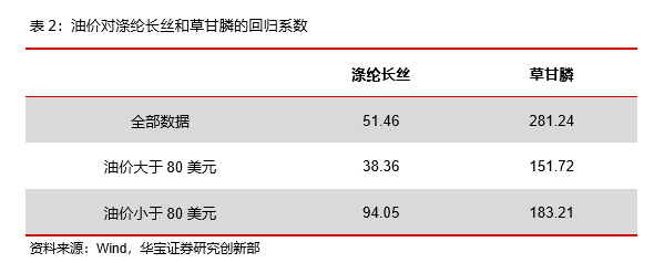 最后,对于石化的下游产品端,我们选取了涤纶长丝和草甘膦两个不同应用场景的终端产品。涤纶长丝被广泛的用于纺织业,草甘膦是一种农药。从相关性上来看,草甘膦和原油价格的相关性仅为0.45,而涤纶长丝和原油价格的相关性仍有0.71。从回归斜率上来看,当油价上行至80美元以上后,两者的斜率都有显著的下降。说明当油价偏高时,原油价格向下游产业链的传导会受到一定的阻碍。