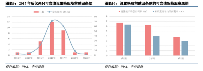 与可转债不同,可交债转股并不涉及新发股份,转换的股份均来自于发行可交债的股东。公开市场上的可交债主要为发行人的减持和债务融资需求服务。作为减持方式,通过发行可交债减持的优势在于过程平滑,对股价影响小,且成本相对较低、受到的限制较少。作为债务融资手段,条款思路核心在于提高转股难度,同时利用含权的特性降低相应的纯债融资成本。不同的发行意愿带来不同的博弈思路,也体现在条款方面的差异,例如可交债特有的特殊条款主要包括换股期前赎回条款、自动下修条款和上修条款。这些特殊条款通常集中于私募可交债,而公募可交债条款通常与转债类似。