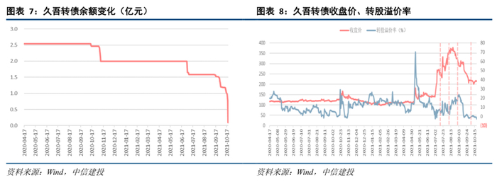 2021年以来,随着转债投资需求日益旺盛,溢价率维持高位,当前转债价格低于100的几乎绝迹,因此即使部分公司正股价格已经触发回售条件的阈值且转债生命周期进入末端,进入到回售期,但是公司面临条件回售的压力有限。而触发附加回售多是在转债生命早期由于更改募集资金用途导致,此时投资者回售诉求更低。从案例来看,2021年下半年以来进行回售的转债主要为触发附加回售条款,回售金额通常不足10万元,大部分回售甚至张数为0。近2年回售规模较大仅有2021年3月的时达转债,2020年8月的辉丰转债,2019年10月的海澜转债。