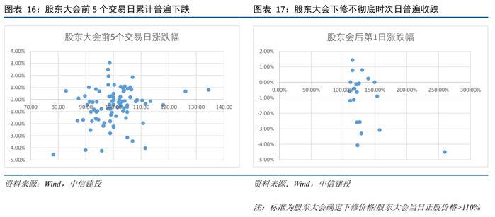 · 介入时机与风险回报:一旦董事会披露下修之后,转债价格通常会迎来反弹。根据我们梳理的情况,在董事会披露下修之后的第1个交易日,转债价格普遍上涨,算数平均的涨幅为3.44%。超预期下修之后,上涨的周期可能会更长,对于未前期埋伏的投资者而言,也提供了上车的潜在机会。根据统计,在董事会披露下修之后的第5个交易日,相较公告披露次日的收盘价仍有一定涨幅,算数平均的涨幅为0.47%。随着股东大会的临近,转债价格可能在利好透支之后回落。根据我们梳理,股东大会的前5个交易日转债的算数平均跌幅为0.52%,考虑到董事会与股东大会通常相隔10-15个交易日,因此对于短期博弈来说,股东大会前5个交易日通常是利好兑现之后的卖点。