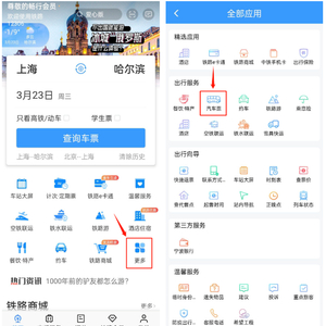 打开“12306”App,点击“更多”找到汽车票功能入口。