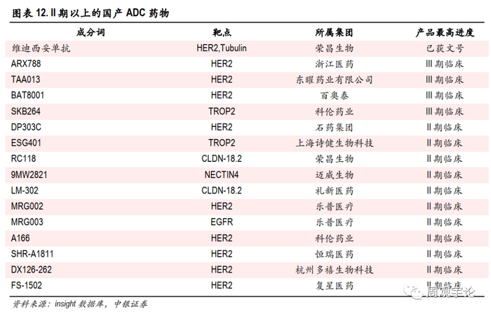 截止2022年4月,除了荣昌生物外,国内浙江医药、东耀药业,百奥泰等均有产品进入到临床III期阶段,上市在即。同时也注意到,国内ADC药物的靶点大部分集中在HER2。药物引进方面,云顶新耀引进的国内首款TROP-2 ADC药物戈沙妥组已经申报上市,华东医药引进的HDM2002全球首个FRα ADC药物已加入全球多中心III期临床。