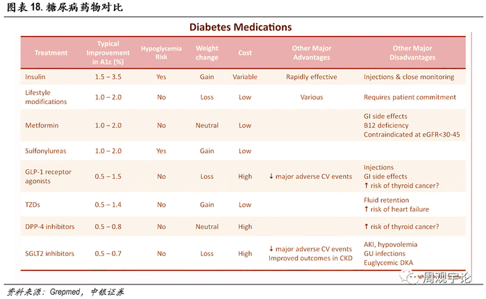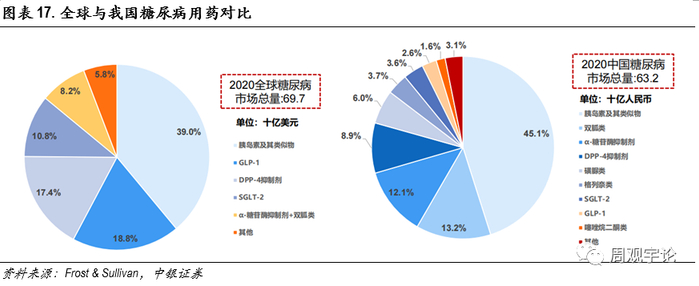 在我国市场中,抗糖尿病的药物主要为传统药,诸如DPP-4、GLP-1等新型药物销售额相比于全球仍旧很低,有非常大的上升空间。