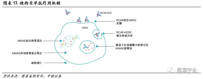 荣昌生物专注抗体药研发,技术领先。以荣昌生物的维迪西妥单抗为例,维迪西妥单抗通过其抗体成分(disitamab)结合在肿瘤细胞表面表达的靶点(HER2),ADC-HER2复合物继而通过内吞作用被肿瘤细胞内吞。然后连接抗体和细胞毒性载荷的连接子在溶酶体蛋白酶存在下被剪切。在MMAE被释放到细胞质后,它就会与微管蛋白结合并抑制其聚合,从而触发细胞凋亡或HER2表达肿瘤细胞程序性死亡。MMAE被释放后,也具有杀死邻近其他肿瘤细胞的能力。