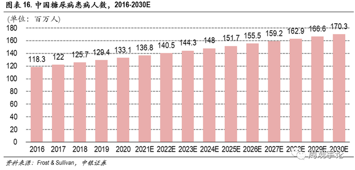 根据Frost & Sullivan分析报告显示,我国是糖尿病大国,患者数量从2016年的1.2亿增长到2020年的1.3亿,复合增长率3.0%,目前我国糖尿病患病人数已位居世界第一。考虑到人口老龄化和不健康的生活方式的负面影响,预计我国糖尿病患病人数将在2025年达到1.5亿,并于2030年达到1.7亿。尽管竞争激烈,我国糖尿病市场具有不容忽视的治疗需求潜力。