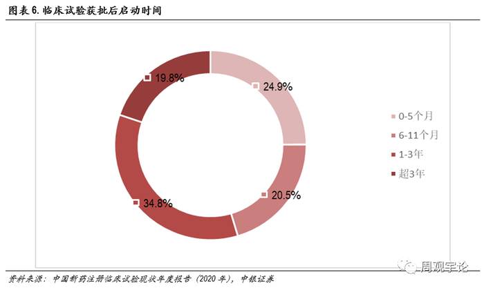 同时,根据临床试验效率分析,临床试验获批后1年内启动招募的不足一半,大多数临床试验仍以早期研发为主,也一定程度上印证了当前行业格局的竞争情况。
