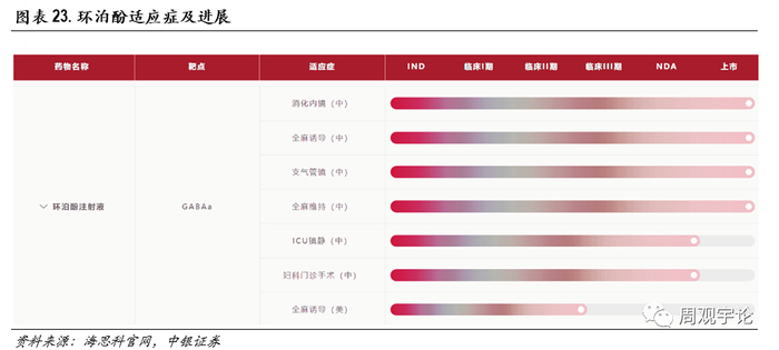 在中国申报上市的同时,环泊酚也在布局国际市场的应用。目前已经在美国进展到III期临床试验,计划入组800人,已完成200人,预计今年将完成。根据丙泊酚在美国每年使用七八千万支的情况,环泊酚在海外拥有非常广阔的市场。