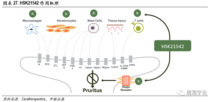 海思科的HSK21542是新型选择性K阿片受体激动剂,仅对KOR有亲和力,不会有其他阿片类药物治疗的副作用,除此之外,还有着不透过血脑屏障、镇痛效果良好等优点。因此它在镇痛方面的潜力和发展空间都较大。HSK21542在针对血液透析瘙痒的适应症上,也具有很大的市场。以美国市场为例,根据Caratherapeutics公司KORSUVA产品报告,目前有50万终末期肾病患者接受透析治疗,60%会有瘙痒的症状,40%的患者有中重度瘙痒,严重时会导致感染和死亡风险。公司计划今年在美国启动II期临床,针对肾病透析瘙痒的治疗。