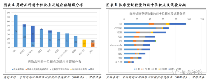 根据《中国新药注册临床试验现状年度报告(2020年)》,生物药靶点同质化集中在PD-1、VEGFR、PD-L1等,细胞治疗仍以CD19靶点为主;适应症主要集中在抗肿瘤和抗感染等领域。虽然2020年整体临床登记增长9.1%,且78%由国内申办者发起,本土创新药企业整体实力增长,但仍然存在同质化严重、热门赛道“扎堆”的情况,一定程度上造成了资源的浪费和竞争的白热化。