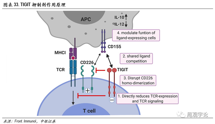 TIGIT抑制剂JS006,lisence-out创收。TIGIT作为一个新的免疫剂检查点,通过下图4种方式调节免疫功能,抑制TIGIT可以有效增加机体的抗肿瘤作用。当前研究的主流集中在PD-(L)1单抗和TIGIT单抗联用治疗NSCLC。目前全球范围内尚无TIGIT类药物上市,罗氏的Tiragolumab单抗进展最快,已经到III期临床,目前的临床试验结果证实TIGIT能显著增强PD-L1单抗的抗肿瘤活性,相比PD-L1单药,联用后ORR实现了翻倍。