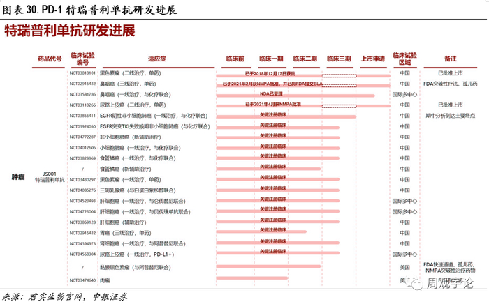 除了信达生物,恒瑞医药、百济神州以及君实生物的PD-1药物依旧在冲刺美国市场。恒瑞医药的卡瑞利珠单抗以肝癌适应症,其对应的国际多中心III期临床研究已在美国、欧洲、韩国和中国等13个国家和地区、100多家中心同步开展。基于此项研究,2021年4月,卡瑞利珠单抗肝细胞癌适应症获得美国FDA孤儿药资格认定。百济神州的替雷利珠单抗治疗二线食管鳞状细胞癌,基于其全球多中心III期临床结果,其新药上市申请已于2021年9月获FDA受理。君实生物的特瑞普利单抗治疗鼻咽癌获FDA突破性疗法认证,已于2021年9月完成FDA提交上市申请,2021年10月获FDA优先审评,预计在近期能收获好消息。