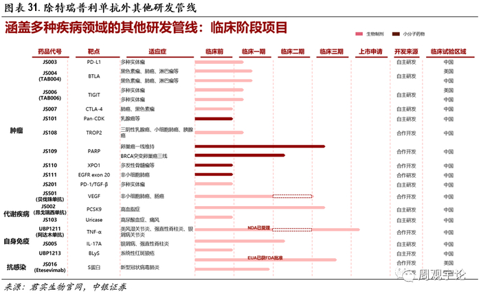 目前JS006在国内临床试验进展到I期。在1月的时候,Coherus已启动行使JS006在美国和加拿大的许可选择权的程序,Coherus将向君实生物支付3500万美元首付款,最高达2.55亿美元的开发、申报和销售里程碑付款,以及产品销售净额18%的销售分成。预计交易将在适用法律要求的政府手续完毕后完成。