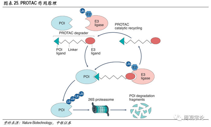 公司现有的新的两个技术平台:PROTAC技术和PDC技术。PROTAC技术潜力大,其利用自身的蛋白酶处理系统降解目标蛋白,定向消除致病蛋白。其作用机理如下图,一端链接E3泛素酶,另一端链接目标蛋白,使得泛素酶上的Ub泛素链转移到目标蛋白上进行标记,后续转移到蛋白酶体中降解。国际上目前有4家PROTAC技术公司已经上市,累积市值达到110亿美元之多。海思科2021年研发的HSK29116 散获批临床,用于复发/难治B 细胞淋巴瘤。这是全球首个获批临床的BTK-PROTAC。目前公司PROTAC项目涵盖10个左右靶点,都为肿瘤领域。