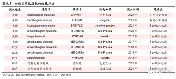 截止2022年4月,美国FDA已批准的CAR-T产品有6款,欧盟批准的CAR-T产品有3款,国内目前也有2款CAR-T产品获批。整个免疫细胞治疗行业正开始进入产业化阶段。