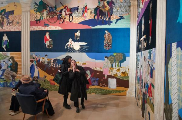 波兰馆内,罗马艺术家 Małgorzata Mirga-Tas 创作了一幅由 12 部分组成的挂毯.