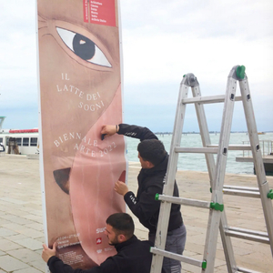 工作人员在威尼斯双年展主要展示地附近布置标识。