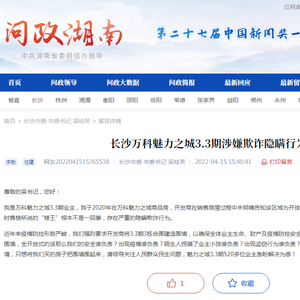 中国质量新闻网讯(邓琴)近日,红网《问政湖南》平台显示,长沙万科魅力之城的业主在该网站进行了投诉维权,声称该楼盘涉嫌欺诈隐瞒行为。目前,长沙市市场监督管理局已作出回复。