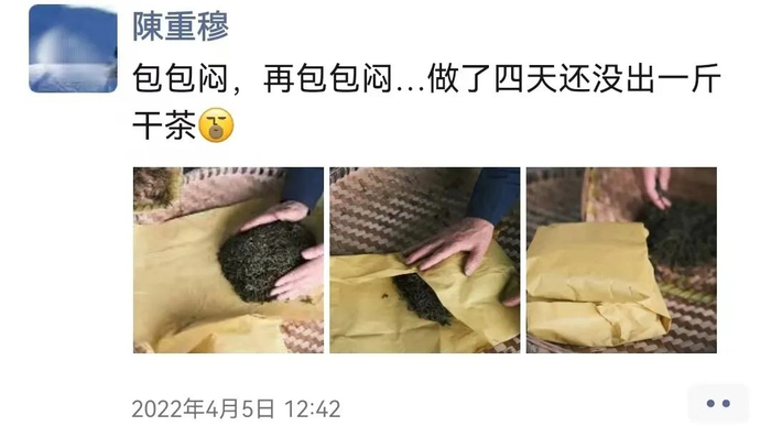 其次,闷黄工艺看似简单,其实极为复杂。因各茶产区的气候、茶树品种不同,仅闷堆的形式就有数种,如湖南宁乡的伪山毛尖多在鲜叶揉前堆积闷黄、平阳黄汤则揉捻后闷黄、君山银针须得初复烘后使用纸包低温焖黄、霍山黄芽一般会薄摊闷堆,等等工艺方式,不一而足。
