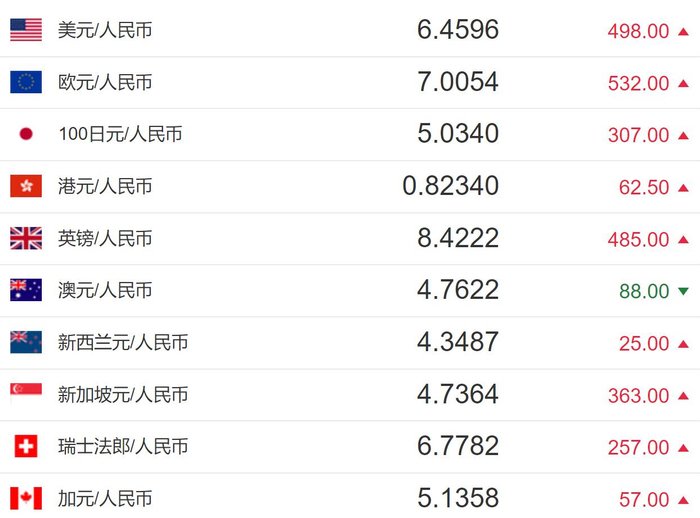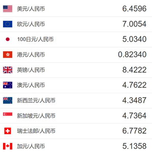 中国人民银行授权中国外汇交易中心公布,2022年4月24日银行间外汇市场人民币汇率中间价为:1美元对人民币6.4596元,1欧元对人民币7.0054元,100日元对人民币5.0340元,1英镑对人民币8.4222元,1澳大利亚元对人民币4.7622元,1新西兰元对人民币4.3487元,1新加坡元对人民币4.7364元,1瑞士法郎对人民币6.7782元,1加拿大元对人民币5.1358元。