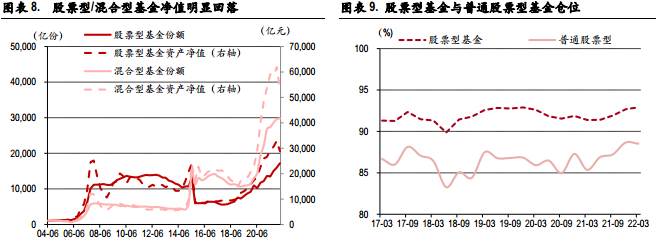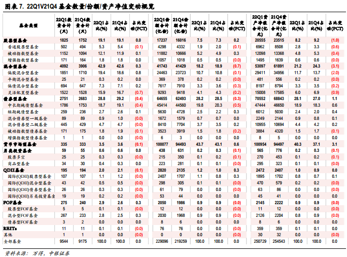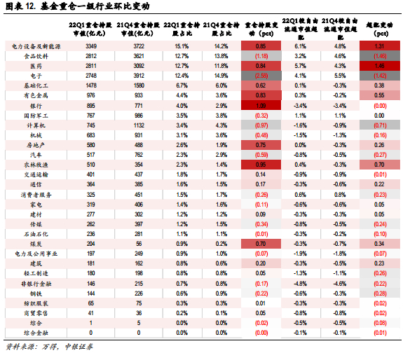 截止4月23日,所有基金22年一季报披露完成,整体来看,22Q1基金总数量微幅增长,其中股票型基金和混合型基金数量及占比较21Q4小幅提升,但资产净值及占比明显下滑,混合型基金净值及占比下滑幅度更大,主要由偏股型及灵活配置型资产净值下跌所构成。四类基金(普通股票型,偏股混合型,平衡混合型,灵活配置型)资产净值本期合计5.18万亿,相较21Q4的6.16万亿缩水15.8%。非权益类基金中,货币型基金、债券型基金资产净值取得明显上涨。仓位视角来看,22Q1普通股票型与偏股混合型基金仓位都出现小幅下降,分别从21Q4的88.66%/86.5%下降至88.51%/84.95%,在一季度指数大幅下跌的背景下,主动性股票基金仓位都出现一定下降,但整体降幅并不明显。行业配置上,银行、农林牧渔、电新、医药,有色 (1.08/0.94/0.85/0.84/0.82PCT)等行业22Q1持仓占比环比21Q4提升明显,电子、食品饮料、计算机,汽车(-2.5/-1.18/-0.97/-0.58PCT)等行业持仓占比环比下降。超配/低配环比变动幅度来看,医药、电新,农林牧渔提升明显,食品饮料、电子,计算机下降幅度较为明显。超配比例来看,电新、医药、电子,食品饮料(6.1/5.7/4.1/3.2PCT)等行业依然维持较大比例超配,非银金融、银行、电力公用、计算机(-4.8/-3.4/-1.9/1.6PCT)等行业仍明显低配。