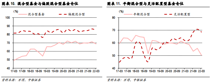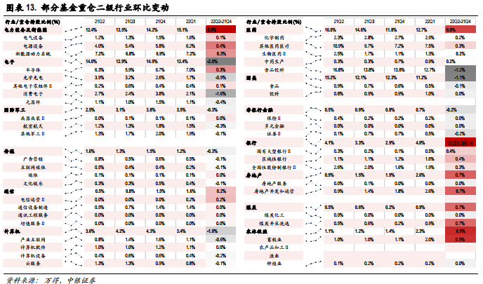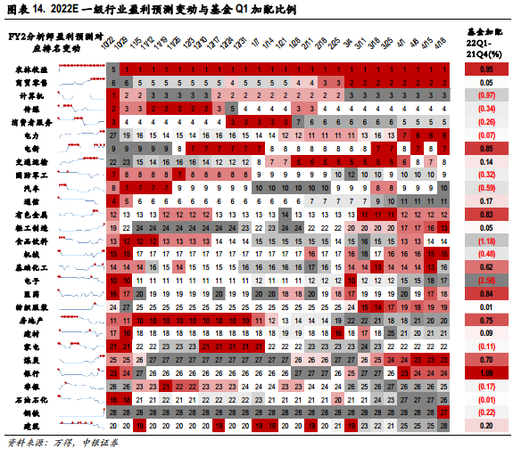行业配置比例进一步下沉来看,高景气行业的配置稳中有升,基本面景气预期仍然较强的细分行业特别光伏,半导体等行业,获得基金逆市持续加仓。软科技成长行业,如消费电子、计算机等行业在估值端压力下配置比例有所降低。消费行业中,医药各细分子行业环比Q4配置比例小幅提升,食品饮料中酒类子行业配置比例明显下滑,农林牧渔中养殖业明显提升。金融地产行业除券商配置比例小幅下滑外,银行和房地产开发等细分子行业皆获得增配。此外,一季度基金加仓的行业与市场一致预期调升方向也具有一定相关性,22Q1获得增配的银行、农林牧渔、电新、医药,有色等行业,区间一致盈利预测大体亦获得同向性的上调,盈利调降方向的计算机、传媒、消费者服务、电子、非银、石化等行业也对应一定程度的减配。