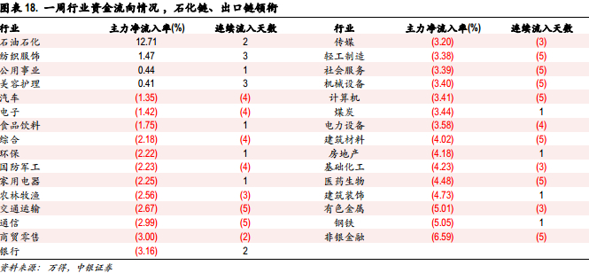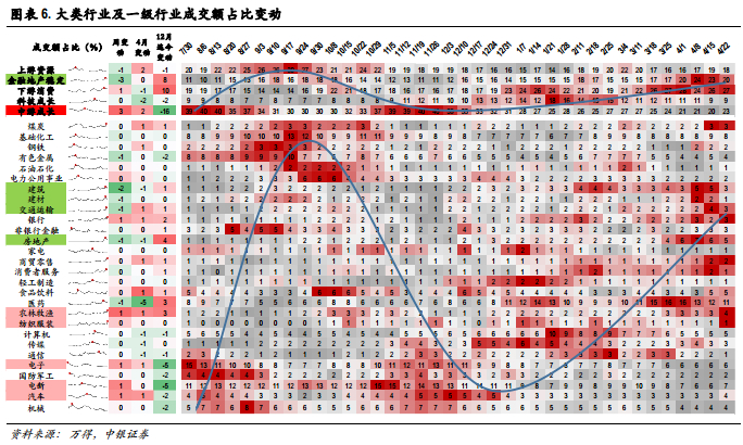 本周仅人民币汇率大幅波动影响下的纺织服装行业上涨,消费行业整体较为抗跌,地产、钢铁,有色等低估值稳增长行业跌幅较深。本周高景气成长行业相对收益企稳止跌,低估值稳增长行业相对收益小幅回落。成交额占比方面,金融地产基建链行业冲高后有所修正,周期、消费行业保持平稳,高景气成长行业有企稳回升迹象。