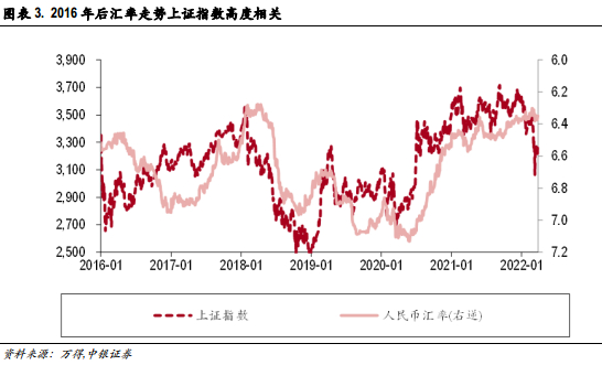 汇率贬值对于当前A股影响可控。2021年末美债利率开始上行,但人民币汇率始终保持相对强劲,这一方面源于去年强劲的出口带来的大量结汇需求,另一方面俄乌冲突等风险因素的冲击使得人民币资产短期避险属性凸显。往后看,美元短周期强势,而国内经济处于仍处于下行中后期,稳增长政策有待发力,人民币汇率短周期内大概率开启贬值步伐。基于上文所属的二维周期定位,当前A股市场短期处于阶段III:开年以来A股市场在内需走弱与美元回流的担忧下表现疲软,低估值防御策略成为首选,这也符合上文所述历史经验与我们年度策略的预判。我们看到2016年以来汇率与A股相关性显著提升,而2022年初以来汇率虽然相对坚挺,但上证综指已经下行了15.19%。当前汇率与A股短期走势出现阶段性背离,海外紧缩及国内需求的悲观预期是导致当前A股出现较大跌幅的主要因素。