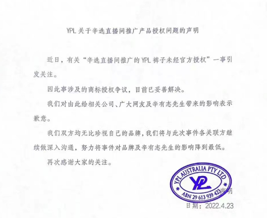就在4月23日晚间,YPL品牌方发布最新声明:“关于辛选直播建推广的YPL裤子未经官方授权”一事涉及的商标授权争议目前已妥善解决,YPL品牌方为给相关公司、网友以及辛有志先生带来的影响表示歉意。”