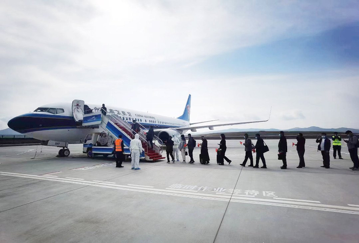 4月22日10时,昭苏天马机场旅客有序登机。