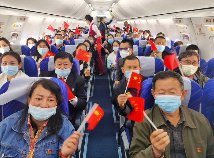 4月22日10时,由中国南方航空集团有限公司执飞的乌鲁木齐—昭苏CZ6681航班上,乘坐首班飞机的游客挥动着国旗。