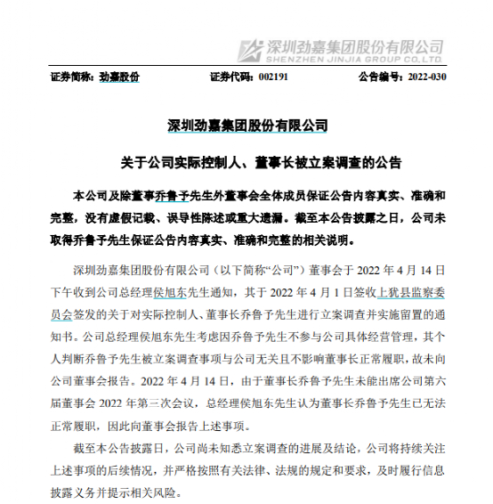 公告显示,劲嘉股份董事会于4月14日下午收到总经理侯旭东通知,其于2022年4月1日签收上犹县监察委员会签发的关于对实际控制人、董事长乔鲁予进行立案调查并实施留置的通知书。
