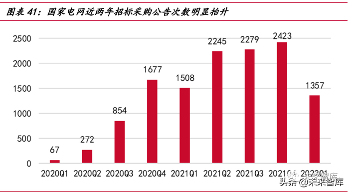 根据国家电网招标采购公告次数,我们发现过去两年,招标采购次数明显上升, 尤其是 2021 年国家提出要建设以新能源为主体的新型电力系统后,招标再次走量。预计 2020Q4-2021Q4 的招标采购放量将对全行业未来两年的业绩构成支撑。