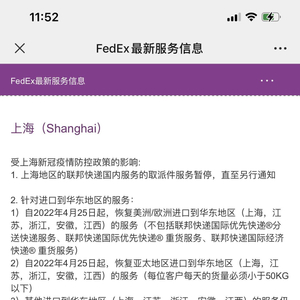 不过,记者在联邦快递的官方微信公众号“FedEx中国”上进一步查询发现,针对进口到华东地区(上海、江苏、浙江、安徽、江西)的服务,自4月25日起,联邦快递恢复美洲、欧洲进口到该地区的服务,暂不包括重货服务和国际优先快递的分送快递服务;同时恢复亚太地区进口到华东地区的服务,要求每位客户每天的货量必须小于50千克。