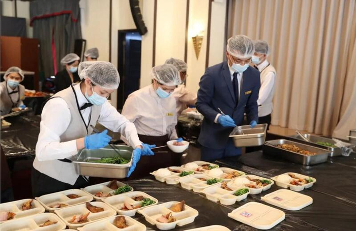 在保障医疗队用餐上,锦江国际颇费心思,统筹了锦江饭店、新锦江大酒店、和平饭店等高星级酒店和锦江餐投公司、高校后勤餐饮公司等餐饮资源,精心研制了早、中、晚、夜宵一日四餐菜单。为提供多样餐饮选择,集团还与百胜中国公司商量,协调所投资的上海肯德基,为援沪医疗队供餐。湖北省援沪医疗队及其指挥部共千余人,下榻在新锦江大酒店,所有医护人员全部进方舱,每天班次多达6班。为此,酒店后厨从早上5时起便开始供应早餐,一直忙到凌晨近3时供应最后一顿夜宵为止。酒店专备了4台保温箱,确保医护人员无论多晚回到酒店,都能吃到热饭热菜。酒店总经理张凯曾有两年在武汉锦江国际大酒店工作经历,他专门连线了武汉酒店的厨师长,来为新锦江的大厨们授课,速成热干面、三鲜豆皮、腊肉炒蒜薹等烹饪方法。有一天,当看见湖北医疗队队员们下班回酒店时,围着厨师长狂赞口味正宗并求合影时,张凯感到无比欣慰。更为细心的是,新锦江大酒店与医疗队领队始终保持密切沟通,悄悄掌握了队员们的生日信息,在队员生日当天,都会送上酒店新鲜出炉的生日蛋糕,迄今已送出近20只。