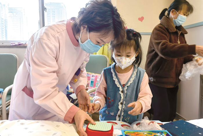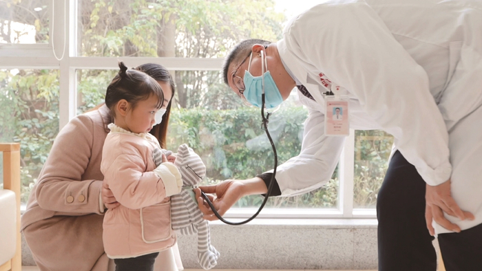儿童病房里,从医40年的老主任周向明弯着腰亲切地和小朋友“打交道”。
