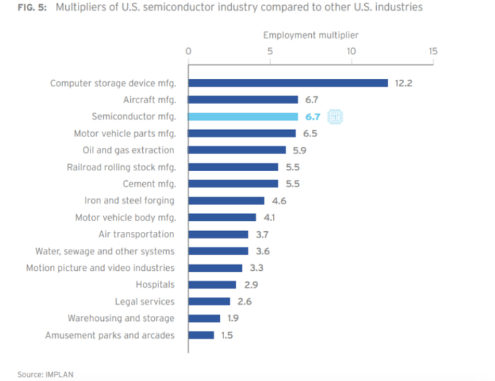 最近,美国半导体协会与牛津经济研究院联合发布一份报告,相比于一般科技行业,一般制造业,半导体产业有巨大拉动效应,半导体产业对经济具有6.7的乘数效应,排在所有534个详细行业乘数效应第85顺位。