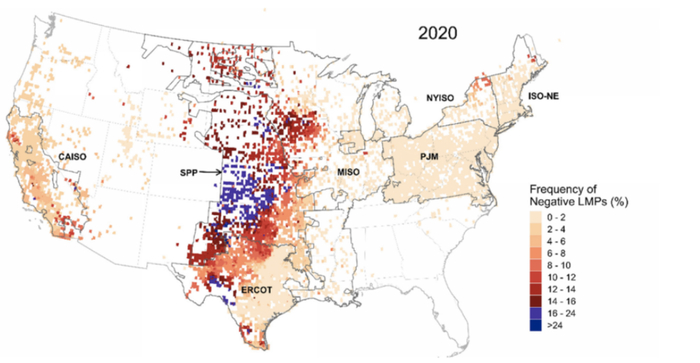 德州西部和俄克拉荷马州西部的一些地区,甚至25%以上时段是负电价。