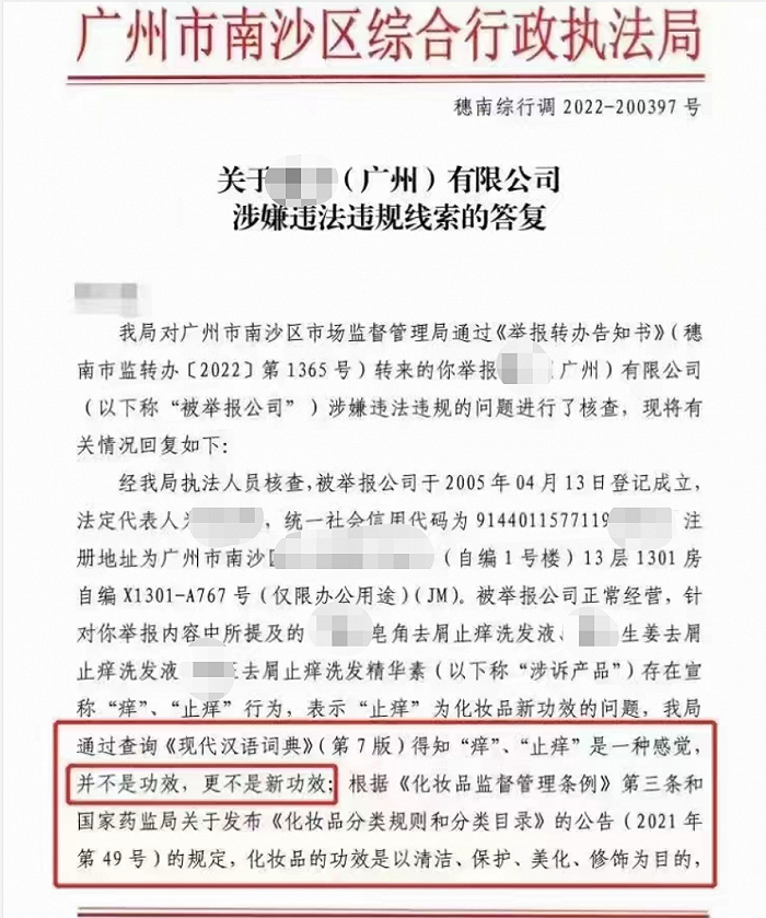 对此,广州市南沙区综合行政执法局(下称南沙执法局)对所举报的内容进行核查并称,“通过查询《现代汉语词典》(第7版)得知‘痒’‘止痒’是一种感觉,并不是功效,更不是新功效,另根据化妆品定义,认为‘止痒’不属于化妆品功效”。