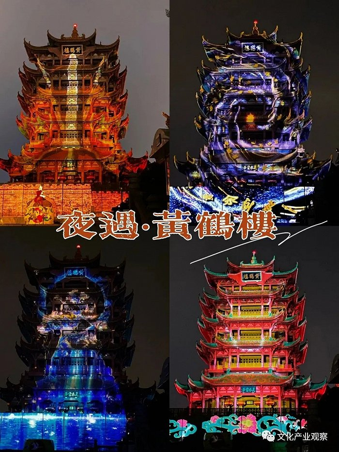 去年国庆假期,武汉市地标黄鹤楼正式开放夜间体验。《夜上黄鹤楼》以“光影+演艺”的“沉浸式”故事演绎的形式亮相。运用激光投影、激光互动、前景纱屏、演员影像互动、3D动画灯、高压水雾等多项光影创新技术,实现光影技术与艺术的完美融合。