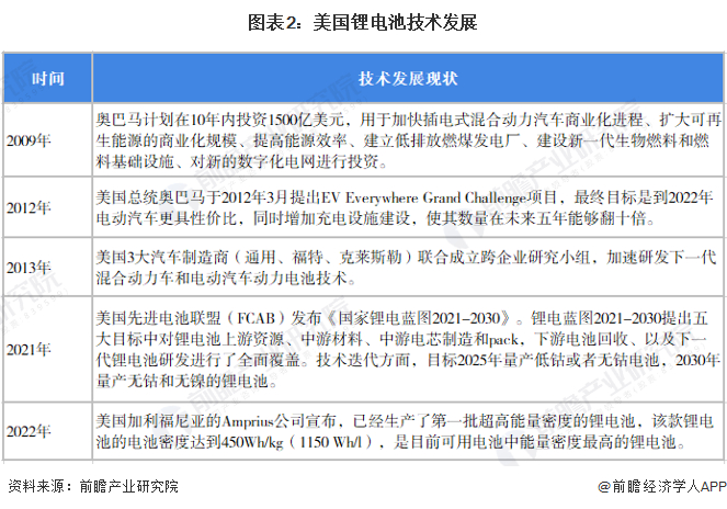 美国锂电池布局技术发展较早。2009年,美国总统奥巴马计划在10年内投资1500亿美元,用于加快插电式混合动力汽车商业化进程、扩大可再生能源的商业化规模;并与2012年3月提出EV Everywhere Grand Challenge项目,推动电动车的普及。2013开始,在政策的推动下,美国3大汽车制造商(通用、福特、克莱斯勒)联合成立跨企业研究小组,加速研发下一代混合动力车和电动汽车动力电池技术;2021年,美国先进电池联盟(FCAB)发布《国家锂电蓝图2021-2030》,指出美国要着力于锂电池的研发和应用,2022年,美国Amprius公司研发出目前能量密度最高的锂电池。