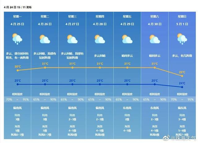 25日,多云部分时间有阳光,有一两阵雨, 气温25℃-30℃;