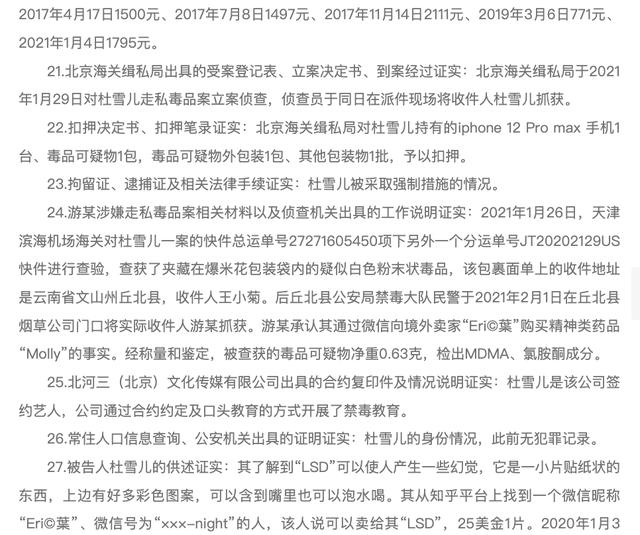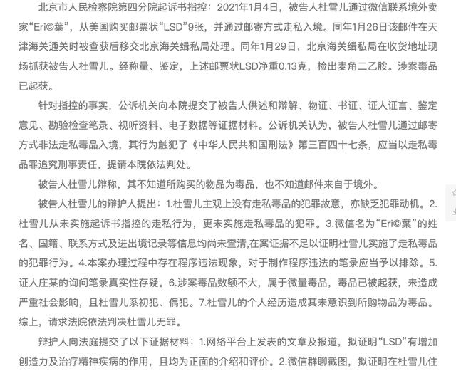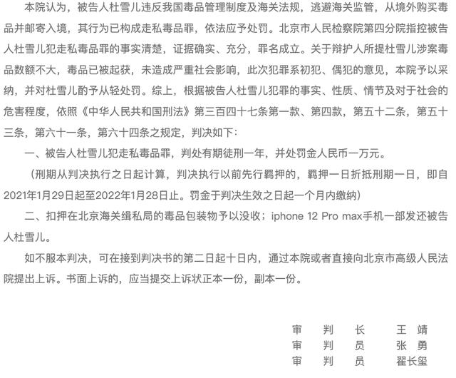 北京市第四中级人民法院刑事判决书显示,被告人杜雪儿,女,1991年12月10日出生,公民身份号码xxx,出生地广东省广州市,硕士研究生文化,北河三(北京)文化传媒有限公司签约艺人,住北京市丰台区;因涉嫌犯走私毒品罪,于2021年1月29日被羁押,同年3月5日被逮捕,现羁押于北京市第一看守所。