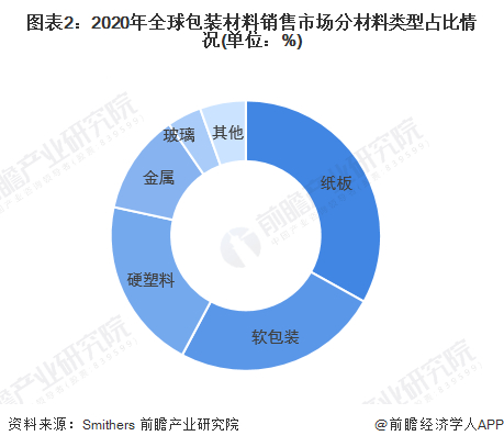 从包装材料类型看,2020年,纸板是全球消费占比最大的包装材料,占比约三分之一;其次是软包装、硬塑料包装的消费占比均超过20%;金属包装占比12%、玻璃包装占比约4%。