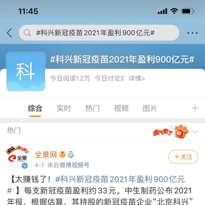 近期“科兴新冠疫苗2021年报盈利900亿”在微博上引发了热议。
