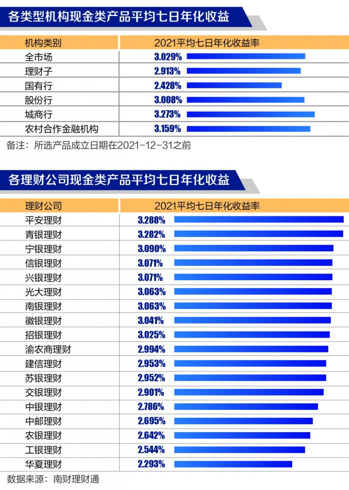 南财理财通课题组对所有投资性质理财产品的收益率进行了分类统计并排名,其中2021年全市场现金管理类产品平均七日年化收益率为3.029%。