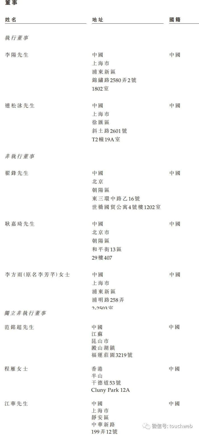 李方雨女士,為非执行董事及李阳的女儿。连松泳为公司CEO,Meiyao持股为16.98%。