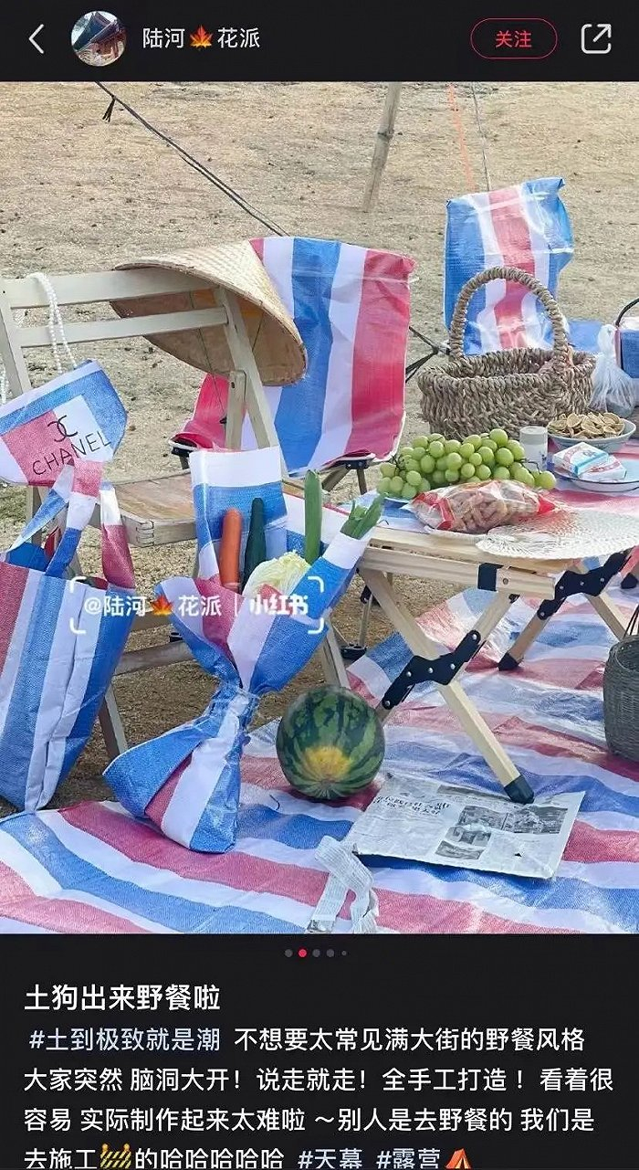 浪漫的主题之外,还有人走“搞笑路线”。一位网友分享,自己和朋友们在农场水库附近野餐,主题是“乡土风”。他们从市场买来施工用的红白蓝彩条布,自己裁剪,做了天幕和野餐垫,包上桌椅和音响,甚至还做了一个手提包。“出发前一晚,三四个伙伴做了几个小时才完成。”主题色就是红白蓝,此外他们还带上奶奶辈常用的暖壶、花瓷碗盘,打眼一看就是“简易版的工地野餐”。